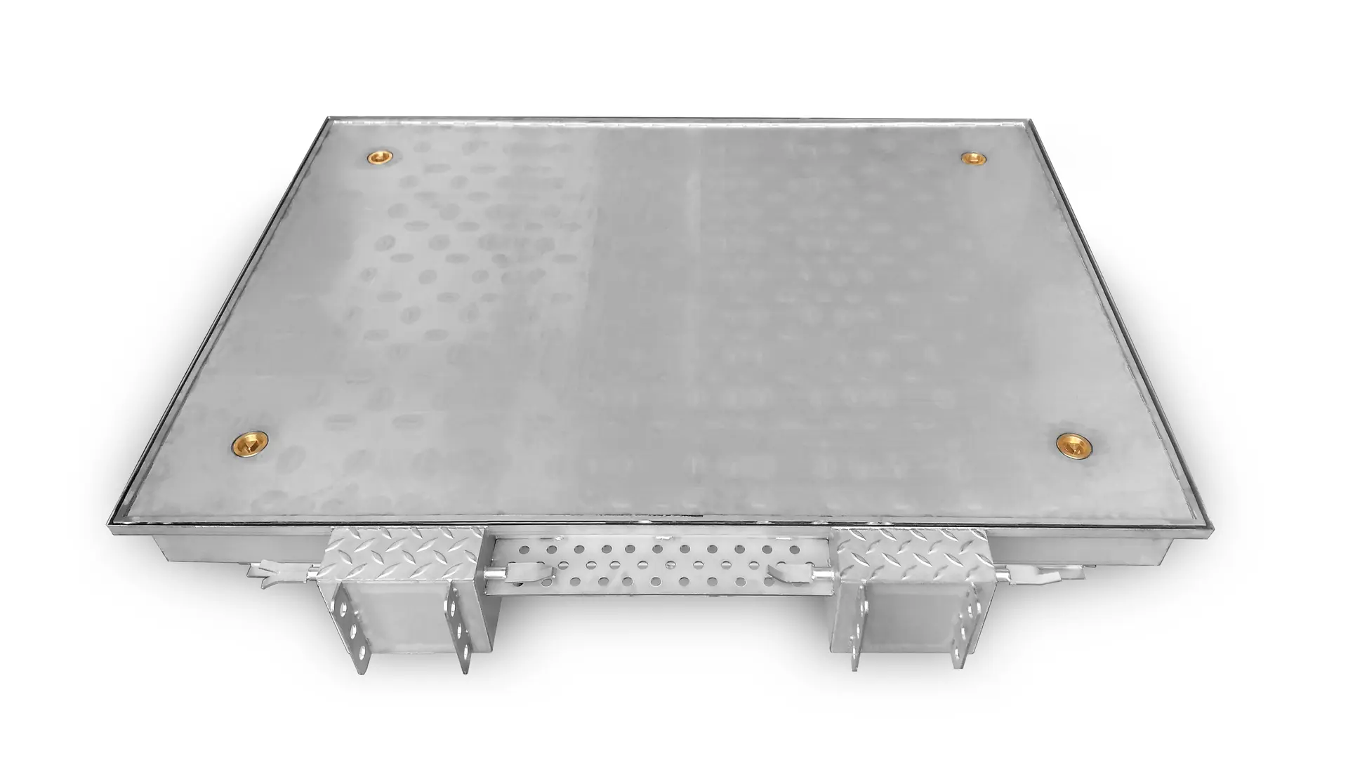 Cada trampilla consta de un marco de montaje de 240 mm de altura y una tapa de chapa estriada de acero inoxidable, con bisagras a lo largo del lado m谩s largo. La trampilla es resistente a gases y agua salpicada, lo que la hace perfecta para su uso en condiciones de alta humedad y requisitos de estanqueidad.